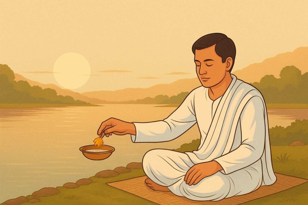 ৩টা লম্বা শ্বাস—ভিতরে, বাইরে। মনে মনে দাদু-ঠামা/পূর্বপুরুষদের ভাবা। - জল প্রস্তুত